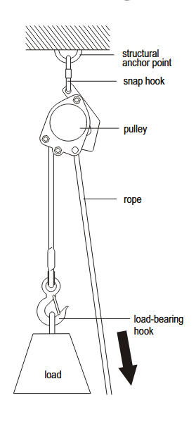 - Befestigen Sie den Karabinerhaken der Rolle am Bauteil der festen Konstruktion. Die statische Tragfähigkeit des Bauteils der festen Konstruktion muss mindestens dem Doppelten des Lastgewichts entsprechen.